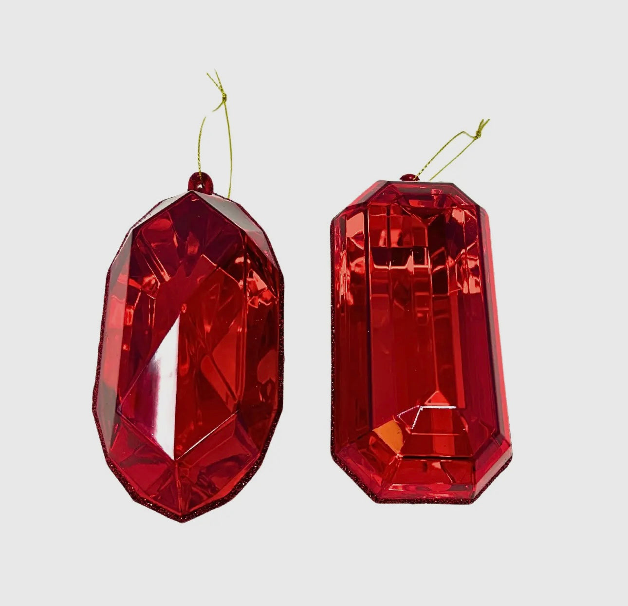 Celebrate the holiday season with this elegant set of two acrylic precious gem ornaments in Red Each set of these 5-inch ornaments features a sophisticated oval and oblong design, adding a refined touch to your Christmas tree or festive décor. Crafted for durability and brilliance, these ornaments bring a timeless sparkle that enhances any holiday setting with expert craftsmanship and style.