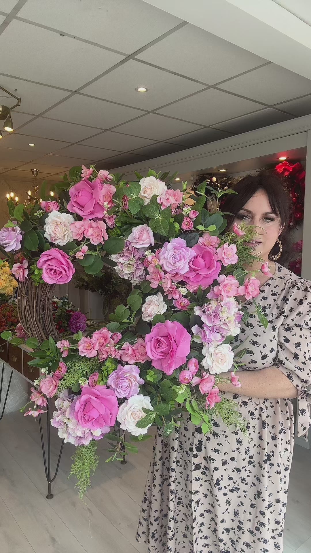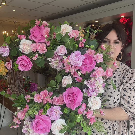 Step into elegance with Arabella, a breathtakingly beautiful wreath designed to make an unforgettable first impression. Bursting with layers of deep pink, soft blush, and gentle lilac, this piece blends romance and sophistication in perfect harmony. Each bloom is thoughtfully arranged to create a sense of fullness and movement, as though freshly gathered from an enchanting garden in full spring bloom.
