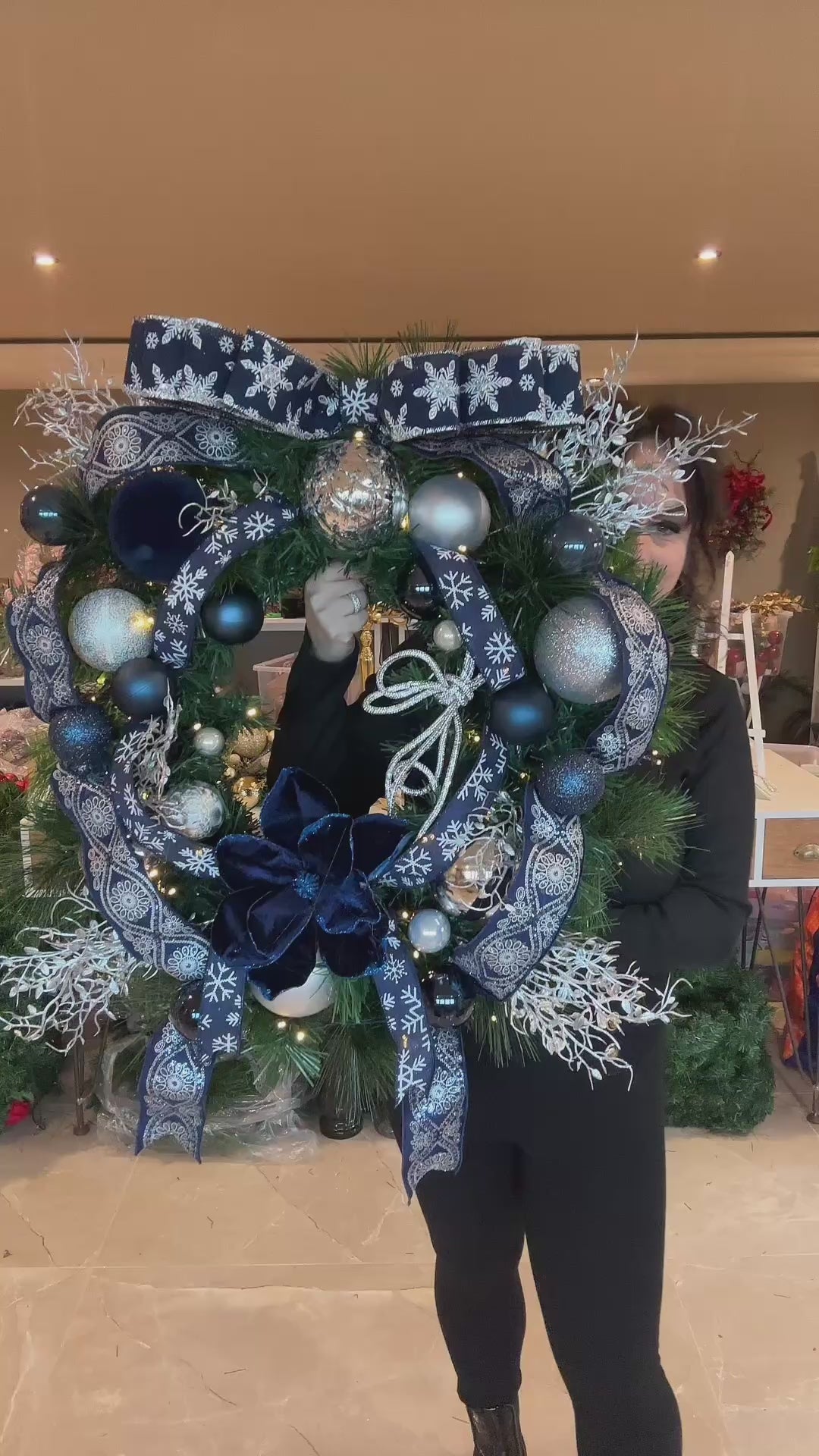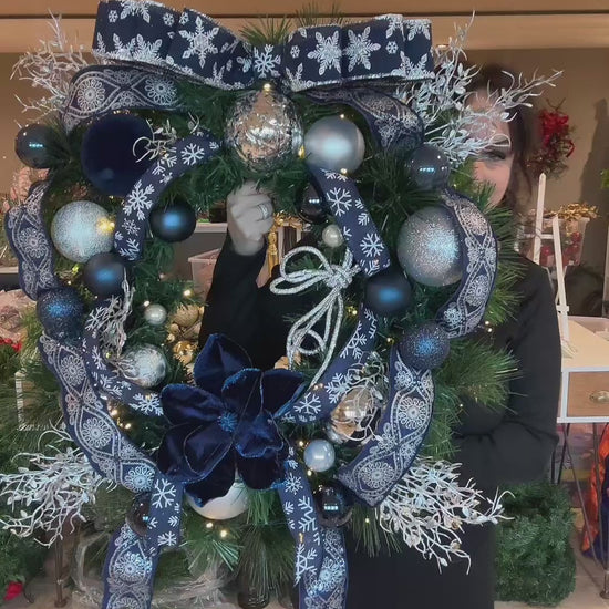 The Navy One is an XL luxury door wreath designed to make a bold statement. Crafted with rich navy tones and layered with premium American ribbon, this wreath offers depth, texture, and timeless elegance. Warm integrated lights add a soft Christmas glow, creating a welcoming and festive entrance throughout the holiday season.